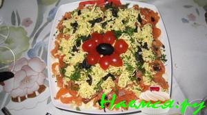 Посередине - соус, вокруг него располагаем сыр, рыбу и маслины.