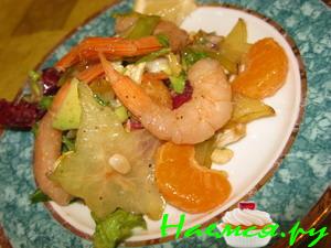 Морковь нарезаем фигурно,салат рвем руками,креветки обжариваем на оливковом масле 2-3 мин.