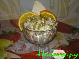 7.Перец, кукурузу, угря и омлет выкладываем в салатник и сбрызгиваем заправкой.