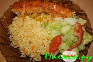 Затем рыбку солим,перчим,кладём картофель,порезанный колечками,смазываем майонезом.Затем опять рыбку.Эту рыбку солим,перчим,кладём морковку,порезанную колечками,смазываем майонезом,и опять пласт рыбки.Затем опять,солим,перчим,кладём лук,порезаный кружочками,смазываем майонезом,опять рыбка.Повторяем слои ещё один раз.Обмазываем майонезом.Заворачиваем в фольгу и выпикаем в предворительно разогретой духовке 30-35 минут.При подаче можно украсить красной икрой.