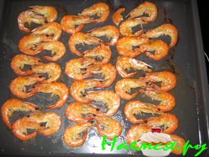 Дальше все креветки поливаем соком лимона. Вкладываем внутрь каждой креветки по 1 ч.л чесночной пасты(можно обычный чеснок через пресс, но тогда его меньше положить).