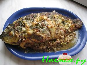 Рыбу помыть делать надрезы с двух сторон. Приготовить маринад из всех ингредиентов,рыбу посолит поперчить и залить маринадом,постараться и в брюшко тоже положить.Замариновать 6-7 часов.не удаляя от маринада запекать в духовке на решетке.