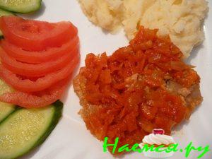 Рыбу отварить в подсоленной воде с добавлением перца горошком и лаврового листа.Отделить от костей.Поломать мелко.Приготовить маринад:2 моркови пережарить с 2 луковицами.Добавить 1ст.воды,1ст.л. томатной пасты,1ч.л. уксуса,соль и сахар по вкусу.Прокипятить и залить им рыбу.Дать настояться часок.