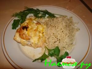 Рыбу положить в форму для запекания, залить сырной смесью и поставить в разогретую духовку.