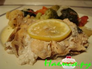 Нарезаем филе на порционные куски.Немного приправим.Кладем колечки лука.Намазываем соус(побольше).