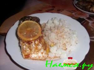 фольгу расстелить сначала выложить гречку, затем лук , сверху рыба, залить майонезной смесью, завернуть и выпекать около получаса