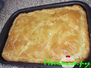 Затем в форму на слой теста уже запеченного выкладываем рыбный салат, сверху выкладываем второй слой слоеного теста, тоже раскатанного под форму, верхний слой теста намазываем тертым сыром с майонезом и в духовку мин. на 10.