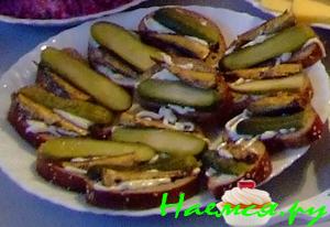 Взять помазаный майонезом хлеб, сверху положить один ломтик киви и маленький кусочек консервированной селедки.