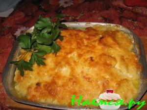 Овощи помыть с щеточкой-мочалочкий и отворить в мундире, овощи должны быть немного сыроватые. Смешать сыр со сметаной до образования однородной массы, добавить измельченный чеснок, перец. Солим, даже пересаливаем это единственный источник соли в этом рецепте. Рыбу режем тонкими ломтиками, что бы лучше резалась рыбу слегка подмораживаем. Овощи уже остыли мы их чистим, режем тонкими кружочками, выкладываем слоями в смазанную растительным маслом форму, каждый слой смазываем сырно-сметанным соусом. У меня получилось так: картофель, рыба, морковь, картофель, рыба, морковь, картофель. Оставляем 2 ложки соуса для готового блюда. Накрываем форму фольгой, запекаем 20 мин. при t 200 C Достаем из духовки снимаем фольгу, ставим обратно в духовку на 15 мин. Готовое блюдо выкладываем из формы, сверху смазываем оставшимся соусом, посыпаем рубленной зеленью.