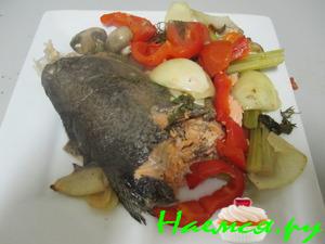 Натераем форель в нутри и с наружи маринадом и оставляем на 1 час.Через час заворачиваем в фольгу и отпровляем в разогретую духовку.Запекаем при температуре 220 градусов в течении 25 минут.За пять минут до готовности открыть фольгу для образования корочки.А пока рыба готовится,подготовить овощи.Перец и огурцы нарезаем колечками,помидоры полукольцами,зелень мелко шинкуем.(или нарезайте как у вас сработает фантазия и украшайте на свой вкус).Когда рыба будет готова,укладываем на блюдо и украшаем овощами.
