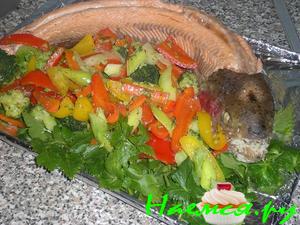 Вытаскиваем рыбку ЕСЛИ У ВАС СОБРАЛОСЬ ГОСТЕЙ И ВЫ ХОТИТЕ ИХ УДИВИТЬ?! ТО КОГДА ВЫТАЩИТЕ РЫБУ ИЗ ДУХОВКИ ОБЛЕЙТЕ БРЕНДИ И ПОДОЖГИТЕ,ГОСТЕЙ ПОРАЗИТЕ И ЭТО ТАК ЭФФЕКТНО :) маленьким ножом откалываете соль (НО БУДЬТЕ АККУРАТНЫ МОЖЕТ СОЛЬ ПОПАСТЬ КОГДА ВЫ ОТКАЛЫВАЕТЕ ЕЁ ОНА ЕЩЁ ГОРЯЧАЯ),затем снимайте шкуру и можете рыбку выложить на овощи или каждому по кусочку порезать.