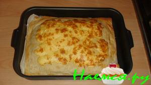 Все закрываем тестом, прокалываем в нескольких местах, смазываем желтком и ставим в духовку.