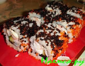 (с начинкой можно импровизировать, кто что любит, авокадо, огурчик свежий, помидорчик, рыбку можно и обжарить, угорь например или лосось, главное чтоб продукты были слабосолеными, так как в сочетании с соевым соусом, соли и так достаточно)