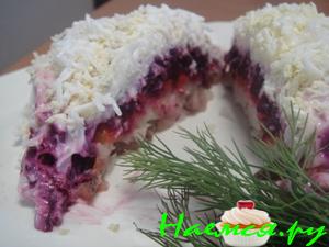 выкладываем слоями: лук, селедку, картофель, свеклу, смазываем майонезом, оборачиваем пластиками свеклы.