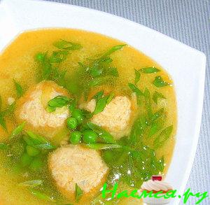 В кипящую воду выложить спассерованные овощи, довести до кипения, добавить горох. Варить 10 мин., добавить кальмары, довести до кипения и выключить газ.