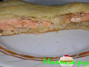 На него выложить замаринованную рыбу с луком и накрыть верхним слоем теста.