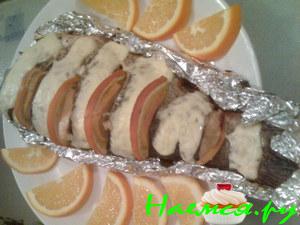 Потом распределить ровным слоем на рыбку и посыпать пармезаном. Запекать при 180 град. до золотистого цвета