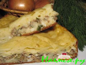 Половину вылить в предварительно разогретую форму. Сверху аккуратно выложить начинку (рыбу хорошенько размять, добавить жареный лук сколько не жалко, порезать и добавить в рыбу яйца).