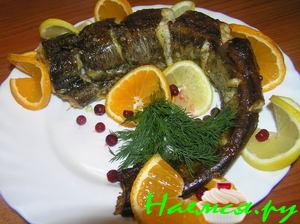 Достала сома с морозилки, положила отогревать...... и когда время настало мыть...... я чуть не упала в обморок....... вонючий просто ужасно...... Приступим. На нос одеваем прищепку - для того, чтобы тщательно помыть сома (не мылся, наверное, всю свою жизнь....)))), извлекаем все внутренности.... В связи с тем, что запах остался, я решила ему устроить молочный бассейн..... где-то на час..... Потом полила лимонным соком и оставила на минут 20. После внутри брюшка смазываем специями... не знаю почему, но мне захотелось положить внутрь кусочек сала и лаврушку, захотелось - значит так и будет))))) заколола зубочистками, положила на брюшко, смазала специями и солью.... В пасть, вместо выкинутой сигареты положила долку лимона.... Положила его на противень, добавила сливок, накрыла фольгой и в духовку на минут 40, после снимаем фольгу и ещё даём минут 10 ему для размышления - курить или не курить.