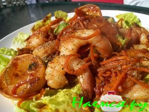 Почистить и порезать лук.Разагреть сковороду,добавить оливкловое масло,закинуть лук и обжарить до золотистого цвета,добавить фасоль+маслины,обжарить 3-4 минуты,затем добавить все сухие специи и жарить 1-2минуты,затем добавить вишнёвый уксус +вино+чили+креветки,пожарить ещё минут 5-6.Отключить,подавать на листьях салата посыпав пармезаном.