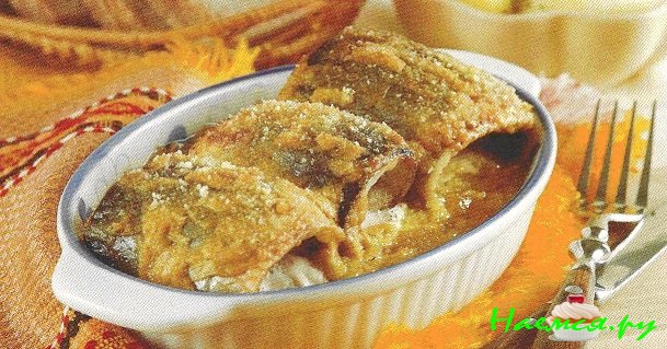 4) Залейте сельдь соусом и присыпьте хлебными крошками. Запекайте 25 минут при 250 °C, пока поверхность рыбы не подрумянится