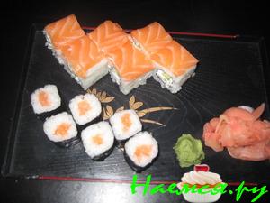 - Урамаки - это маки наизнанку, в которых рис находится снаружи, а нори - внутри. Такой способ заворачивания был придуман японскими поварами в Америке в 70-х годах для тех, кто не любил вкус нори. Урамаки часто обсыпаются кунжутом или икрой для декора. Самые известные урамаки - это Калифорния и Филадельфия.