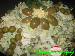 Соеденить курицу,капусту,грибы,горошек,сыр.