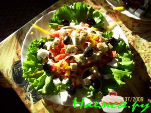 Выкладываем порезанные оливки, всё перемешиваем и заправляем оливковым маслом.
