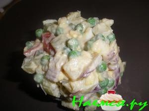 Морковь и цуккини нарезать на тонкие полоски, картофель сварить и нарезать кубиками, смешать с остальными ингредиентами.