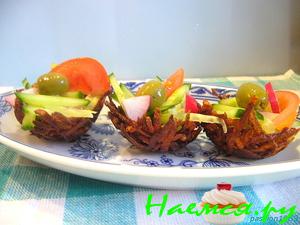 Приправу для салата,соль,перец и мелко нарезанный лук смешать с растительным маслом .Добавляем соломкой натертые огурец,морковь и яблоко .Перемешиваем и раскладываем салат по гнездышкам .