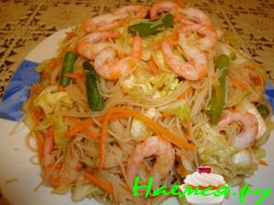 Салат крупно нарвать. Лук очистить порезать полукольцами. Собрать салат: листья салата, вермишель, грибы, лук и заправить салат.