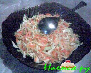 Покрошить лук и капусту, добавить к салату, заправить маслом и перемешать. Салат уже вкусный на этой стадии.