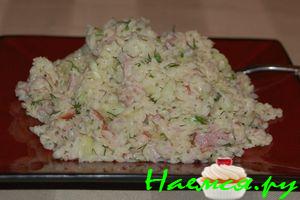 Свежие огурцы,укроп и листья салата смешать.Всё посолить и добавить майонез(по желанию можно заправить сметаной или натуральным йогуртом,кто как любит).