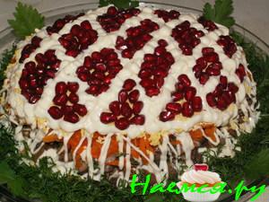 На курицу выложить морковь (немного присолить), полить майонезом, далее - белки (немного присолить), майонез, огурец, майонез, сверху выложить слой из желтков и произвольно в качестве украшения выложить ананасы.