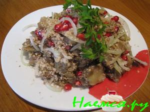 Баклажаны очистить,порезать кружочками посолить.Через некоторое время отжать и обжарить на растительном масле с двух сторон. В готовые баклажаны добавить зерна граната,зелень,специи.Лук нарезать полукольцами и слегка пассировать.Главное не пережарить и снять с огня когда он чуть изменит форму.