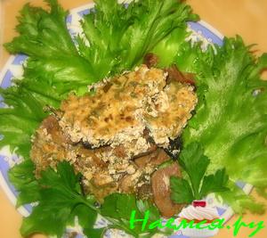 Язык отварить, нарезать крупными кусками, положить в кастрюлю, добавить поджаренный лук, отваренные и поджаренные грибы. Орехи и чеснок истолочь в ступке в однородную массу так, чтобы из орехов выступило масло. Смешать со сметаной, (если не желаете использовать сметану, ее можно заменить сливками 33% жирности) посолить, поперчить и залить этим соусом язык. Накрыть крышкой и поставить в слабо нагретую духовку, чтобы соус не кипел.