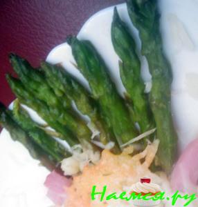 альше. В центр тарелки выкладываем спаржу в беконе. Если полоски бекона широкие, то их вполне можно порезать на три полоски в каждую полоску заворачиваем по три мини-спаржи (заранее приготовленные на пару - 4 минуты). Т.к. бекон с/к, то он хорошо затягивает спаржу... не рвется... Ставим спаржу в середину салата, как на фото (кстати, после того, как в бекон закутали спаржу ее концы я подрезаю, чтобы композиция была устойчивой)