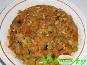 В чашку с баклажанами налить холодную воду.Перемешать баклажаны в воде и, хорошо отжав, добавить в казан.