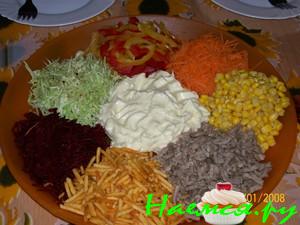 Тарелку смазать щедро майонезом и выкладывать по кругу.