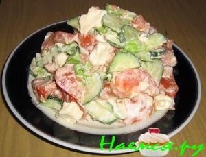 Огурцы и капусту нарезать соломкой. Измельчить листья салата,лук.укроп.чеснок. Всё перемешать и заправить соком лимона.Украсить яйцом.