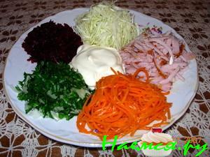 морковку,редьку,свеклу потереть на терке как на корейскую морковь,всё в сыром виде.картошку тоже потереть и обжарить в масле до золотистого цвета,колбасу порезать полосками и обжарить.Всё разложить на круглое блюдо,когда все сядут за стол перемешать.