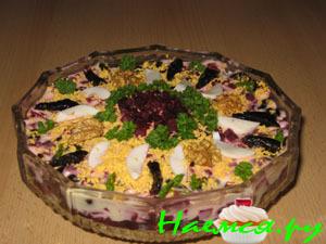 Выложить на блюдо слоями: грибы, затем приготовленную смесь, вновь грибы, еще слой смеси, каждый ряд промазывая майонезом. Сверху украсить салат половинками чернослива и крошками орехов.