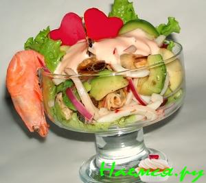 Все ингредиенты уложить в любом порядке.Полить майонезом и украсить неочищенной креветкой.