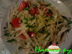 Режем огурец кольцами.Режим помидоры.Режим листья салата.Режим капусту.,а так же зелень.Смешиваем все и поливаем оливковым маслом,добавив несколько капель сока лайма и специи.Сверху украшаем порезанными маслинами