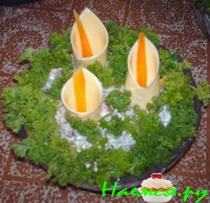 Украсить цветами, сделанными из сыра и моркови и зеленью.