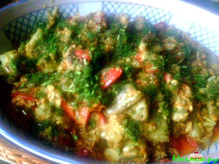 Тем временем на растительном масле поджарить лук полукольцами,добавить к луку морковь потертую на мелкой терке и перец красный сладкий,порезаный соломкой.Все пережареные овощи сложить в емкость,а на сковороде на сильном огне обжарит наши баклажаны мин 5-7,помешивая,потом к баклажанам в сковороду прибавить овощную смесь,перемешать и добавить 3ст.л. сметаны,можно майонез.Жарить помешивая еще мин 5-7.Выключить огонь,в салат добавить 1- зубчика чеснока ,подавать теплым,посыпав укропом.
