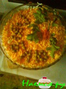 Рыбу размять вилкой, лук измельчить, картошку, морковку и яйца натереть на крупной тёрке. Выложить слоями: рыбу, лук, морковку, яйца, картошку, каждый слой посолить, поперчить и смазать майонезом. Отрезать 2 тонких ломтика свеклы и вырезать зон и трость, остальную свеклу натереть на крупной тёрке и выложить вокруг салата. Огурец разрезать на тонкие пластинки и уложить "дождинки", украсить веточками петрушки.