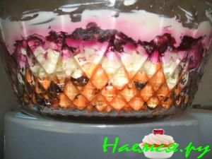 Морковь натереть на мелкой тёрке заправить солью и майонезом, сверху уложить слой распаренного изюма. Сыр натереть на мелкой тёрке, чеснок пропустить через пресс, смешать с сыром и майонезом, уложить третьим слоем. Свеклу натереть на мелкой тёрке, сок отжать, посолить свеклу и смешать с майонезом, выложить поверх сыра. Последний слой - измельчённые грецкие орехи. Дать салату настояться несколько часов и подавать.