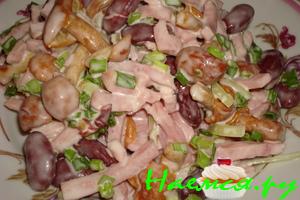 Лук репчатый режем на кубики и заливаем его на 10 минут уксусом яблочным (3 столовые ложки + 1 стакан кипяченной воды. Потом сливаем жидкость из лука и добавляем в салат.