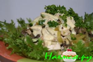 На хорошо раскалёной сковороде с минимум растит. масла минутки 2 припустить шампиньоны,сбрызнув лимон.соком, постоянно помешивая, затем добавить лук и также помешивая припустить лук до прозрачности (лук должен оставаться хрустящим, грибы не должны успеть пустить сок). Шампиньоны с луком остудить, затем смешать их с огурцом и морковью-соломкой (огурец нарезать брусочками , посыпать солью и дать настояться минут 10-15, затем слить появившуюся жидкость,а огурец соединить с ингредиентами), добавляем мелко рубленую петрушку и кусочки копчёной курочки.